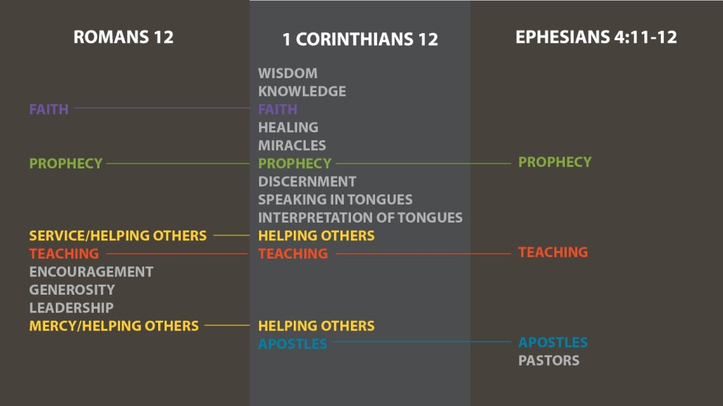 Spiritual gifts are distinct from natural talents and abilities, although they may be married to them. Spiritual gifts are ways God works through us to do the supernatural work of his Kingdom. I can preach to you. I might, every so often, preach a message that will make you say, “Amen!” But I cannot make a lasting change in anyone’s life with my words without the Holy Spirit being in operation. The natural gift must be subsumed by a spiritual gift.