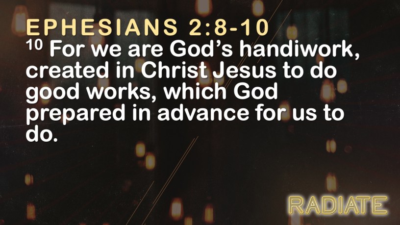8 For it is by grace you have been saved, through faith—and this is not from yourselves, it is the gift of God— 9 not by works, so that no one can boast. 10 For we are God’s handiwork, created in Christ Jesus to do good works, which God prepared in advance for us to do.