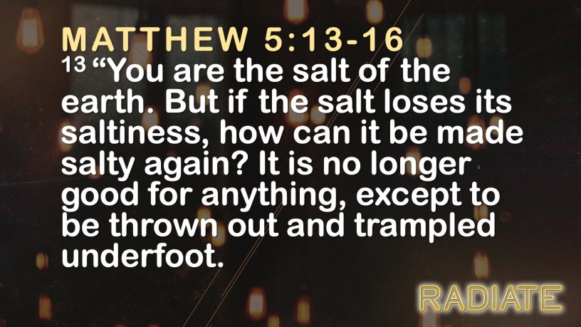 13 “You are the salt of the earth. But if the salt loses its saltiness, how can it be made salty again? It is no longer good for anything, except to be thrown out and trampled underfoot.