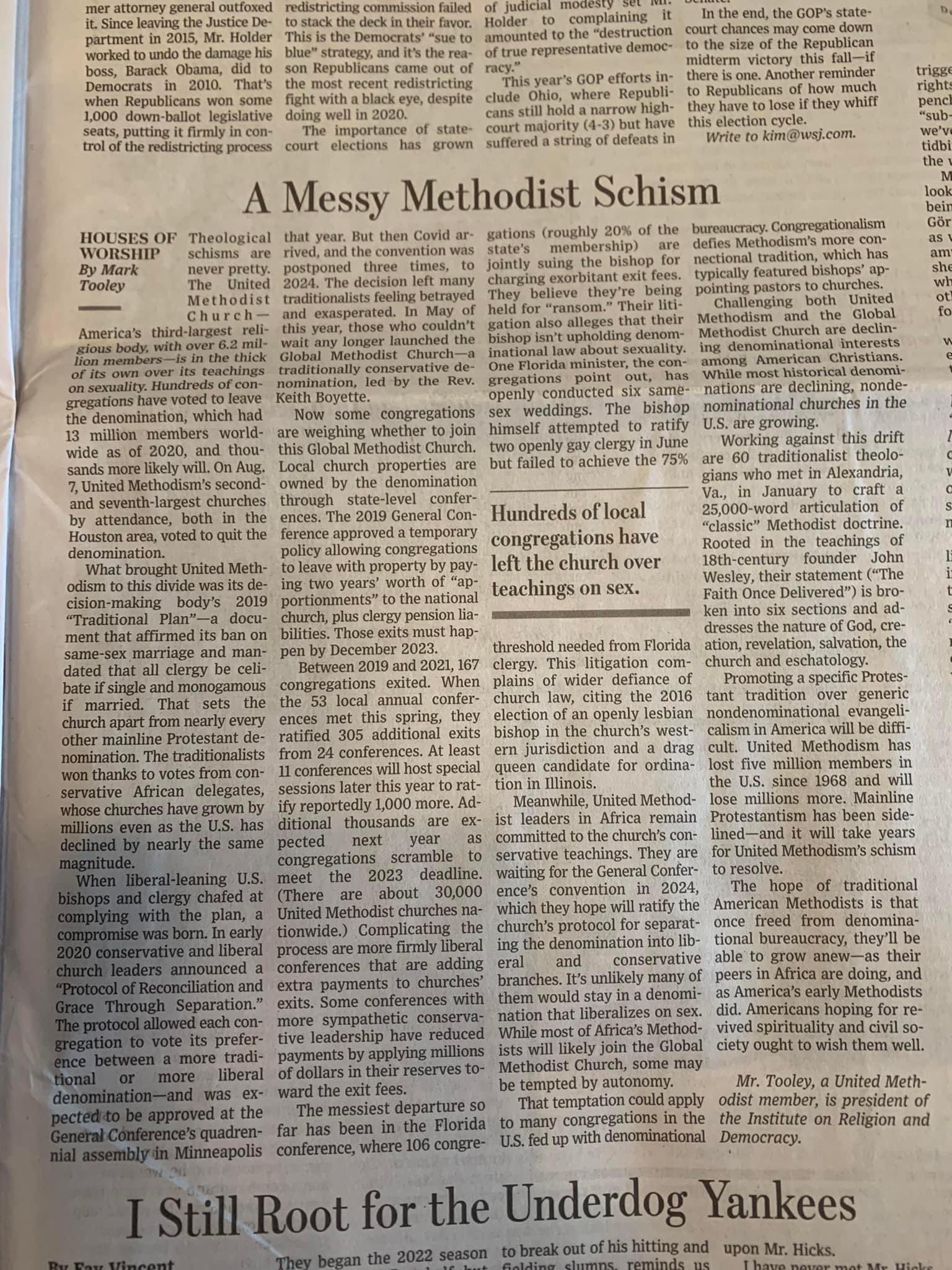 “The Messy Methodist Church Schism” by Mark Tooley via The Wall Street Journal. The head of IRD covers Methodist schism for America’s leading financial newspaper. View JPG here. (Added 8-19-2022)