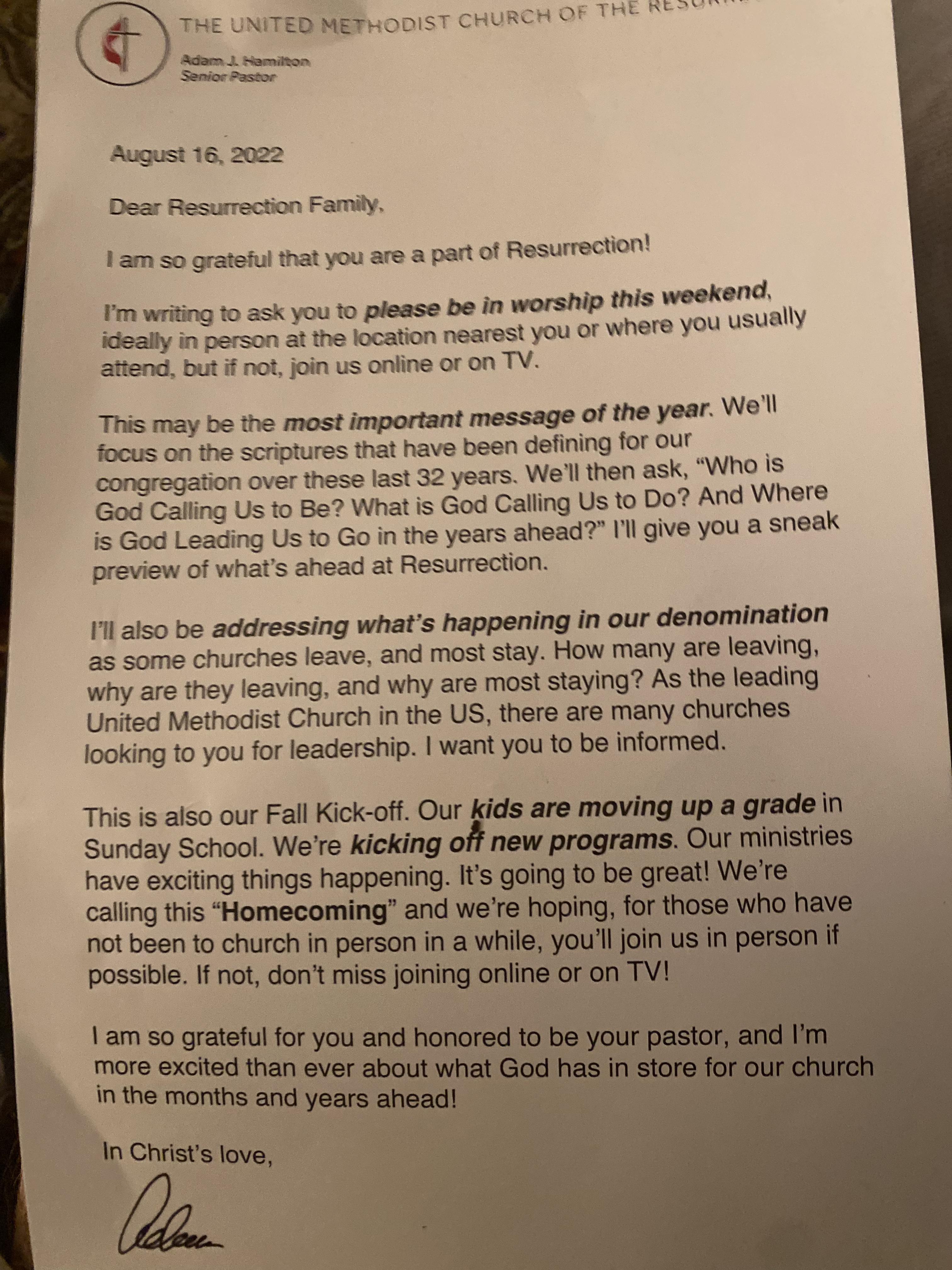 Tweet by Kat Bailey “This is an amazing letter being circulated among First United Methodist, Huntsville members with permission. It is in response to the pastor who’s only been there for four months & was pushing GMC on parishioners in a shady way.” The letter is by Stan Copeland and is attached to the tweet as an image file. It predicts the demise of the GMC, the rebound of the UMC, and posits that Bishop Jones will be joining the staff of St. Andrew in Plano upon his retirement. (Added 10-27-2022)