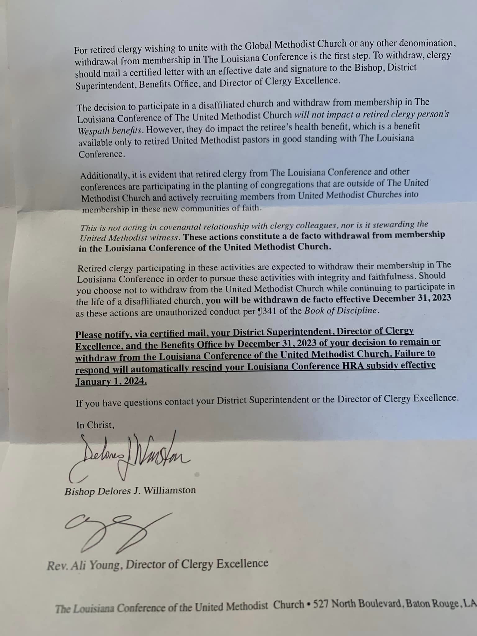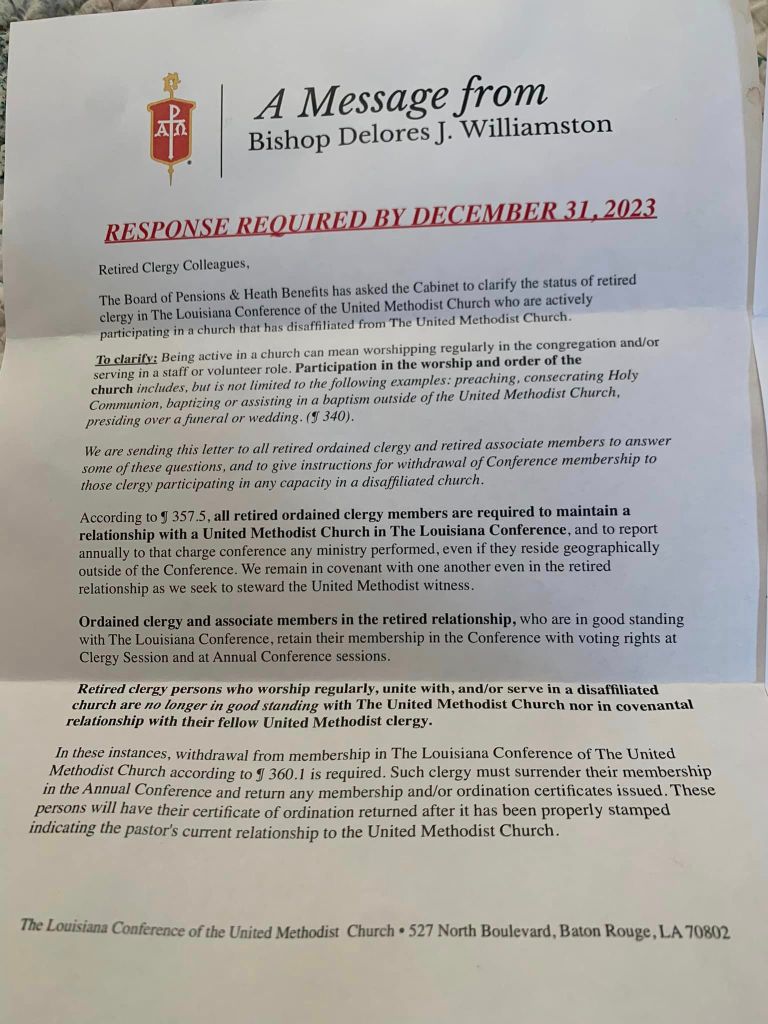 The letter from Bishop Williamston, included below, requires retired Louisiana clergy to send a certified letter or lose the conference health benefits they earned through years of service. Failure to do so, she says, will be considered a de facto withdrawal of clergy membership. The bishop cites Par. 341, unauthorized conduct, as the basis for a default withdrawal. But there is nothing in this paragraph about limiting ministerial activities to the UMC [re-baptizing, reorganizing a pastoral charge without permission, and conducting same-sex weddings are listed explicitly.] Ecumenism is a stated UM value. There are, however, several subsequent paragraphs requiring due process when the status of a clergy person is altered.