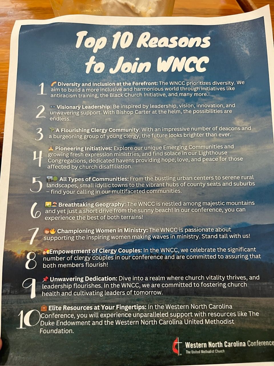 Overheard: The UMC Western North Carolina Conference has recently lost two historical congregations for which they fought hard (Wesley Memorial in High Point and Longs Chapel in Lake Junaluska… capitol of the SEJ), and three large suburban Charlotte congregations (Good Shepherd with 99.1%, Concord Crossroads with 100%, and Weddington will 98.2%). With the earlier exits of Christ Church in Hickory and Rocky Mount in Lake Norman, these churches represent six of the top ten by attendance. The overall disaffiliation loss represents 10 of the top 20, and the conference is on track for losing 350 of the original 1000 congregations by the end of 2023. (Added 9-13-2023)